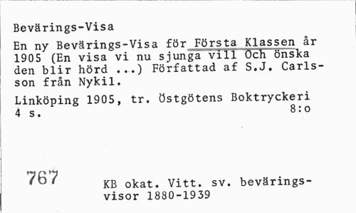 //// Bevärings-Visa //// En ny Bevärings-Visa för Första Klassen år 1905 (En visa vi nu sjunga vill Och önska den blir hörd ...) Författad af S.J. Carlsson från Nykil. //// Linköping 1905, tr. östgötens Boktryckeri 4 s. 8:o //// 767 KB okat. Vitt. sv. bevärings- //// visor 1880-1939 ////