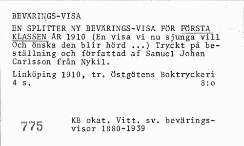 //// BEVÄRINGS-VISA //// EN SPLITTER NY BEVÄRINGS-VISA FÖR FÖRSTA KLASSEN ÅR 1910 (En visa vi nu sjunga~vTll Och önska den blir hörd ...) Tryckt på beställning och författad af Samuel Johan Carlsson från Nykil. //// Linköping 1910, tr. östgötens Boktryckeri 4 s. 8:o //// >7er4 KB okat. Vitt. sv. bevärinss-* //// ' visor 1880-1939 ////