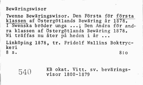 //// Bewäringswisor //// Twenne Bewäringswisor. Den Första för första klassen af Östergötlands Bewäring år 1878. I Swenska bröder unga ...; Den Andra för andra klassen af Östergötlands Bewäring 1878. Wi träffas nu åter på heden i år ... //// Linköping 1878, tr. Fridolf Wallins Boktryckeri //// 8 s. 8:o //// rr in KB okat. Vitt. sv. bevärings- //// visor 1800-1879 ////