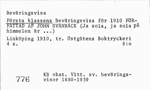 //// Beväringsvisa //// Första klassens Beväringsvisa för 1910 FÖR-TÄTTAD AF JOHN SVÄNBÄCK (Ja sola, ja sola på himmelen är ...) //// Linköping 1910, tr. östgötens Boktryckeri 4 s. 8 :o //// pr-p KB okat. Vitt. sv. bevärings- //// bOb visor 1880-1939 ////