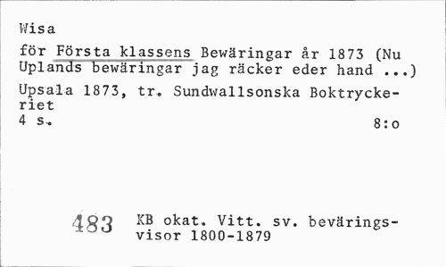 //// Wisa //// för Första klassens Bewäringar år 1873 (Nu Uplands bewäringar jag räcker eder hand ...) //// Upsala 1873, tr. Sundwallsonska Boktryckeriet //// 4 s. 8: o //// 1 Q o KB okat. Vitt. sv. bevärings- //// ±0° visor 1800-1879 ////