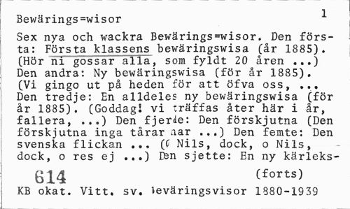 //// Bewärings=wisor 1 //// Sex nya och wackra Bewärings=wisor. Den första: Första klassens bewäringswisa (år 1885). (Hör ni gossar"alla, som fyldt 20 åren ...) Den andra: Ny bewäringswisa (för år 1885). (Vi gingo ut på heden för att öfva oss, ... Den tredje: En alldeles ny bewäringswisa (för år 1885). (Goddag! vi träffas åter här i år, fallera, ...) Den fjerde: Den förskjutna (Den förskjutna inga tårar aar ...) Den femte: Den svenska flickan ... (C Nils, dock, o Nils, dock, o res ej ...) Een sjette: En ny kärleks- //// £14 (forts) //// KB okat. Vitt. sv. beväringsvisor 1880-1S39 ////