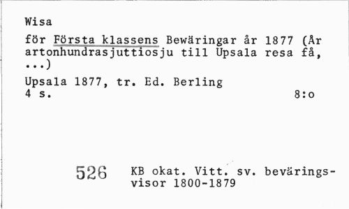 //// Wisa //// för Första klassens Bewäringar år 1877 (Är artonhundrasjuttiosju till Upsala resa få, //// Upsala 1877, tr. Ed. Berling 4 s. 8:o //// 526 KB okat. Vitt. sv. bevärings- //// visor 1800-1879 ////