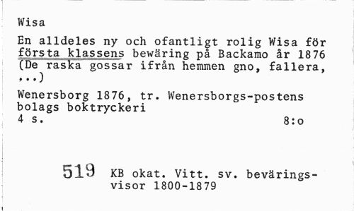 //// Wisa //// En alldeles ny och ofantligt rolig Wisa för första klassens bewäring på Backamo år 1876 (De raska gossar ifrån hemmen gno, fallera, * • •) //// Wenersborg 1876, tr. Wenersborgs-postens bolags boktryckeri //// 4 s. 8:o //// 519 KB okat. Vitt. sv. bevärings- //// visor 1800-1879 //// j ////
