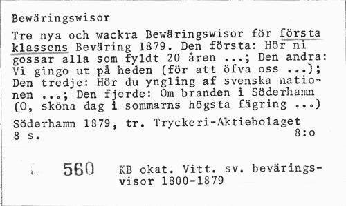 //// Bewäringswisor //// Tre nya och wackra Bewäringswisor för första klassens Beväring 1879. Den första: Hör ni gossar alla som fyldt 20 åren Den andra: //// Vi gingo ut på heden (för att öfva oss .,.)» Den tredje: Hör du yngling af svenska nationen ...; Den fjerde: Om branden i Söderhamn (0, sköna dag i sommarns högsta fägring ..«,) //// Söderhamn 1879, tr. Tryckeri-Aktiebolaget 8 s. 8:o //// «¦ 560 KB okat. Vitt. sv. bevärings- //// visor 1800-1879 ////