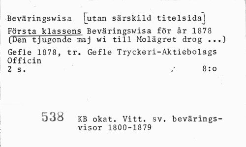 //// Beväringswisa [utan särskild titelsida^ //// Första klassens Beväringswisa för år 1878 (Den tjugonde maj wi till Molägret drog ,..) //// Gefle 1878, tr. Gefle Tryckeri-Aktiebolags Officin //// 2 s. / 8:o //// 538 KB okat. Vitt. sv. bevärings- //// visor 1800-1879 ////