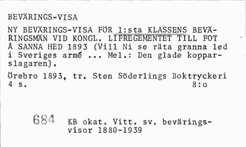 //// BEVÄRINGS-VISA //// NY BEVÄRINGS-VISA FÖR l:sta KLASSENS BEVÄ-RINGSMÄN VID KONGL. LIFREGEMENTET TILL FOT A SANNA HED 1893 (Vill Ni se räta granna led i Sveriges armé ... Mel.: Den glade kopparslagaren) . //// Örebro 1893, tr. Sten Söderlings Boktryckeri 4 s. 8 :o //// 684 KB okat. Vitt. sv. bevärings- //// visor 1880-1939 ////