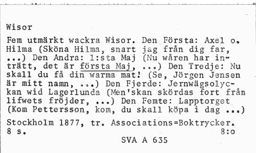 //// Wisor //// Fem utmärkt wackra Wisor. Den Första: Axel o. Hilma (Sköna Hilma, snart jag från dig far, ...) Den Andra: l:sta Maj (Nu wåren har inträtt, det är första Maj, ...) Den Tredje: Nu skall du få din warma mat i (Se, Jörgen Jensen är mitt namn, .„.) Den Fjerde: Jernwägsolyc-kan wid Lagerlunda (MenTskan skördas fort från lifwets fröjder, ...) Den Femte: Lapptorget (Kom Pettersson, kom, du skall köpa i dag ...) //// Stockholm 1877, tr. Associations=Boktrycker. //// 8 s. 8:0 //// SVA A 6 35 ////