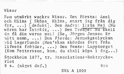 //// Wisor //// Fem utmärkt wackra Wisor. Den Första: Axel och Hilma ( Sköna_ Hilma, snart jag från dig far, ..,) f de fekt*]« Den Andra: 1: s ta Maj (Nu wåren har xnträdt, ...) Den Trecije: inu skall du få din warma mat] (Se, Jörgen Jensen är lått namn, o..) Don Fjerde: Jernwägsolyckan wid Lagerlunda (Men'skan skördas fort från lifwets fröjder, o..) Den Femte: Lapptorget (Kom Pettersson, kom, du skall köpa i dag.,.) //// Stockholm 1377, tr» Associations--Boktrycke-, riet //// 8 s. (något def.) 8:o //// SVA A 1009 ////