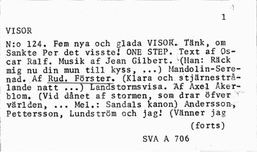 //// h //// 1 //// VISOR //// N:o 124. Fem nya och glada VISOR. Tänk, om Sankte Per det vissteJ ONE STEP. Text af Oscar Ralf. Musik af Jean Gilbert. ^(Han: Räck mig nu din mun till kyss, ...) Mandolin-Serenad. Af Rud. Förster. (Klara och stjärnestrålande natt .'..) Sandstorms vis a. Af Axel Åkerblom. (Vid dånet af stormen, som drar öfver ' världen, ... Mel.: Sandals kanon) Andersson-, Pettersson, Lundström och jag.' (Vänner jag //// (forts) //// SVA A 706 ////