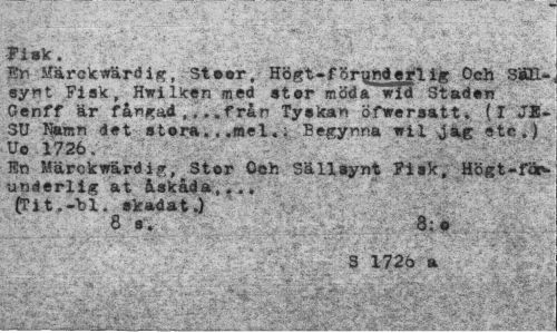 //// -Fisk //// Er Sfärcicw&rdiK, St o or, Höftt-fSrgftdorl ig Och S«l-eynt Fisk, Hwilkren med stor möda wid Stadon Genff är fångad .„från Tyskan öfwersatt, (I 3U Namn det stora...mel.; Begynna wil 4ag etc.) Uo 1726. //// En Märckwärdi£, Stor Och Sällsynt Fisk, Högt-f&w underlijsr at åskåda,... (Tit.-bl. skadat.) //// 8 s. 8:o //// ' ".;¦ -C ' » " ' '.V-/-: • ' "V!,- % //// S 172b a //// . .¦ ? i //// - - zmw^M 1 * ////