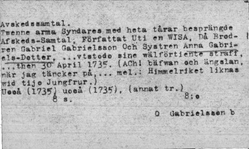 //// Avskedssamtal. //// Twenne arma Syndares med heta tårar besprängde Af sked s-Samtal, Författat Uti en WISA, T>å Brödren Gabriel Gabrielsson Och Systren Anna Gabriels-Dotter, ...vtstodo sine wälfört i enté "FFraTf", .TTEHirr^ April 1735. (AChl bäfwan och ängslan, när jag täncker på,... mel.: Himmelriket liknas wid tijo Jungfrur.) Uooå 11735"] uooå (1735), (annat tr.) //// ös. 8:o //// 0 Gabrielsson b //// " ' '^v.' . . . v': " ,v" : ¦,; -1 . v".:-'';v.; ////