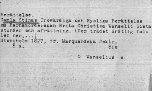 //// Berättelse. //// Gamla Stinas Trovärdiga och Rysliga Berättelse om Ba r näm crcTé r s k a n Erita Christina Wanselii Sista stunder och afrättning. (Der trädet änatlig faller ner,.. .) //// Stockholm 18*7, t,r. Marquardska -boktr. 8 s, 8;o //// 0 Wanselius s ////