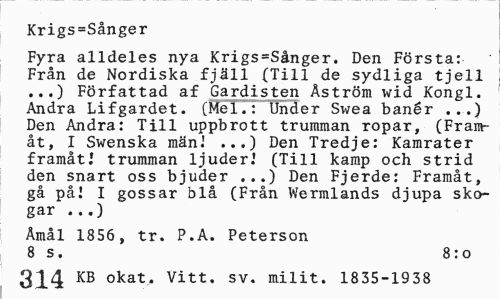 //// Krigs=Sånger //// Fyra alldeles nya Krigs=Sånger. Den Första: Från de Nordiska fjäll (Till de sydliga tjell ...) Författad af Gardisten Åström wid Kongl. Andra Lifgardet. (HeI7: "Oncler Swea banér ...) Den Andra: Till uppbrott trumman ropar, (Framåt, I Swenska män.' ...) Den Tredje: Kamrater framåt.' trumman ljuder.' (Till kamp och strid den snart oss bjuder ...) Den Fjerde: Framåt, gå påJ I gossar blå (Från Wermlands djupa skogar ...) //// Ämål 1856, tr. P.A. Peterson 8 s. 8:0 //// 314 KB okat« Vitt. sv. milit. 1835-1938 ////