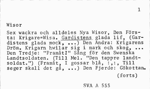 //// 1 //// Wisor //// Sex wackra och alldeles Nya Wisor, Den Första: Krigare=Wisa. Gardistens glada lif, (Gar-distens glada mock, ...) Den Andra: Krigarens Dröm. Krigarn hwilar sig i mark och skog, ... Den Tredje: "Framåt!" Sång för den Swenska Landtsoldaten. (Till Mel. "Den tappre landt-soldat.") (Framåt, I gossar blå, :,:, Till seger skall det ga, ...) Den Fjerde: Gökottan. //// (forts) //// SVA A 555 ////