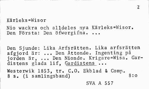//// Po //// Kärleks=Wisor //// Nio wackra och alldeles nya Kärleks=Wisor. Den Första: Den öfwergifna. ... //// Den Sjunde; Lika Arfsrätten. Lika arfsrätten afgjord är: ... Den Åttonde. Ingenting på jorden är, ... Den Nionde. Krigare=Wisa. Gar-distens glada lif, Gardistens ... //// Westerwik 1853, tr. C.O. Ekblad & Comp» 8 s. (i samlingsband) 8:o //// SVA A 55 7 ////