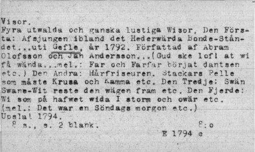 //// Visor. //// Fyra utwalda och ganska lustiga Wisor, Den Första: Af sjungen ibland det Hederwärda Bonde-3tån« det.,.uti Gefle, år 1792. Författad af Abram Olofsson ocK TUFft Andersson...(Gud ske lofl at wi få wanda. . .mel.: Far och Farfar börjat dantsen etc.) Der Andra: Hårfriseuren. ötackars Pelle som måste Krusa och ^amma etc. Den Tredje: Swän Swane-Wii reste den wägen fram etc. Den Fjerde: Wi som på hafwet wida I storm och owär etc. (mel,; Det war en Söndags morgon etc.) Uoslal 1794-. //// P s., s. 2 blank. F:o //// E 1794 o ////