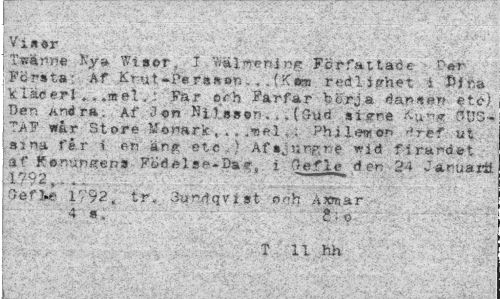 //// Yii«sr //// Tmtem* Kya. Wisor. I VfUlTtröpg För fa t tade Första- Af Krut-Persson. , , (Kam redlighet i Pina 'klaceri . ».mel. r Far orh Farfar börja dansen etc} Den Andra, Af Jon Nilsson... (Gud sifirne GUS- //// TAF wår Store Monark, .. .mel,; ?h i lem or» ''ref ut 82 na får i en ang etcj Af stungne wid firandet af Konungens Födelse-Dag, i Gefle den 24 JaruariJ //// 1:792 ,- . > , : v ' : ¦- -i- ' ¦ - . : ' V . Gen*? 1792 6 tr. 3ur?dqvist och A »nar 4 s . ? '« o //// II.. ' ! : ¦ , T 11 ' v\ ////