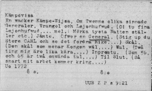 //// Kämpevi sa //// En wacker Kämpe-V/ij sa, Om Twenne olika sinnade Generaler, Wrangöl och Lejonhufwud. (01 tu fina Lej onhufwud ,. .. mel.; Mörka tysta Natten ställer etc.) Jämte. Cfwer en General. (Stig up du Store CARL och se det f ord nMlW? ...) Skål. (Den skål som menar Konger, wäl,...) Wal. (Twå ting mig äro lika kära,...} Inprcmtu. (Som och 65 är twå omwända. tal,...) Til Slut. (Sa snart is it arbet kommer kring,».») Uo 1772 //// 8 s. 8:0 //// UUB Z P a y;21 ////