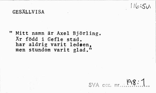 //// GESÄLLVISA //// " Mitt namn är Axel Björling. Är född i Gefle stad. har aldrig varit ledeen, men stundom varit glad." //// SVA c:c. ////