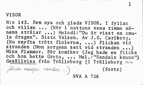 //// 1 //// VISOR //// N:o 143. Fem nya och glada VISOR. I fyllan och villan ... (När i nattens sena timma månens strålar ...) Melodi:"Du är visst en smula dragen". Sista Valsen. Av J.G. Carlberg. (Nu snyfta trött fiolerna, ...) Flickan vid stranden (Hon sorgsen satt vid stranden ...) Mina Flammor. För komiker (Jag hade en flicka och hon hette Greta, ... Mel.:"Sandals kanon") Gesällvisa från Trälleborg (I Trälleborg Km //// Wt-sk* hwwjoh randas: (forts) //// SVA A 726 ////