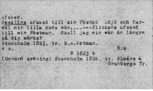//// Afsked i //// Ge sä II na af sk ed till sin Fås tnj o Adjö och far-wäl min lilla goda wän;...--Flickans afsked till sin Fästman. Skall jag nin wän än längre på dig wänta? //// Stockholm 1823, tr. E.a.Ortman. 4 3. 8;o //// 5 1623 b //// (Om värt* ordning) Stockholm 1826» tr, FLm^na & //// Granbergs Tr. ////