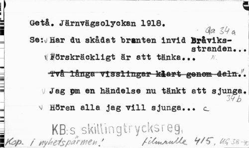 //// ' 1 i Getå. Järnvägsolyckan 1918. //// [ -4a //// ] SetvHar du skådat branten invid Bråviks- //// stranden... t förskräckligt är att tänka... //// = -fvå l&ngB'^ti^liirgar-4eåa^-gencmi daln.". //// Jag pm en händelse nu tänkt att sjunga. //// Znb //// . v Hören alla jag vill sjunga... c. //// I KB: skiUi n g t r y eks reg, ////