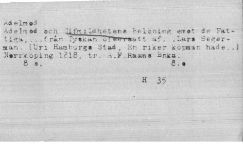 //// Ad elm od //// Adelmod och Ilfmi Idhet er.f Belöning emot de Fat - //// „ . . . f rår Ty »k an olliiM»att af, .Lar* Seger» ma?» . CUri Hamburg* Stad , Er: riker köpman hade,,) Norrköping 1218, tr. A.F..Raams Erika. //// 8 a.* //// H 35 ////