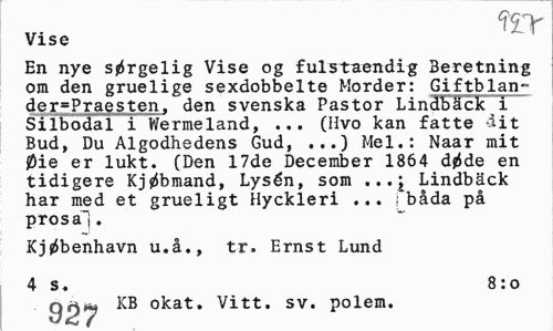 //// Vise //// En nye s^rgelig Vise og fulstaendig Beretning om den gruelige sexdobbelte Horder: Giftblan-der=Praesten, den svenska Pastor Lin3FScF~T~ Silbodal i Wermeland, ... (Hvo kan fatte dit Bud, Du Algodhedens Gud, ...) Mel.: Naar mit jöie er lukt. (Den 17de December 1864 d^de en tidigere Kj^bmand, Lysén, som . ..j, Lindbäck har med et grueligt Hyckleri ... fbåda på prosal. //// Kj^benhavn u.å., tr, Ernst Lund //// 4 s. 8:0 //// qr^Hj KB okat. Vitt. sv. polem. ////