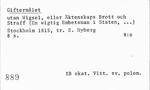 //// Giftermålet //// utan Wigsel, eller Äktenskaps Brott och Straff (En wigtig Erabetsman i Staten, ...) //// Stockholm 1815, tr. E. Nyberg 8 s. 8:0 //// gg g okat. Vitt. sv. polem. ////