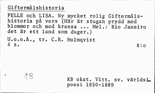 //// Giftermålshistoria //// PELLE och LISA. Ny mycket rolig Giftermålshistoria på vers (Här är stugan prydd med blommor och med kransa ... Mel.: Rio Janeiro det är ett land som duger.) //// U.o.o.å., tr. C.R. Holmqvist 4 s. 8:0 //// KB okat. Vitt. sv. världsl- //// poesi 1850-1889 ////