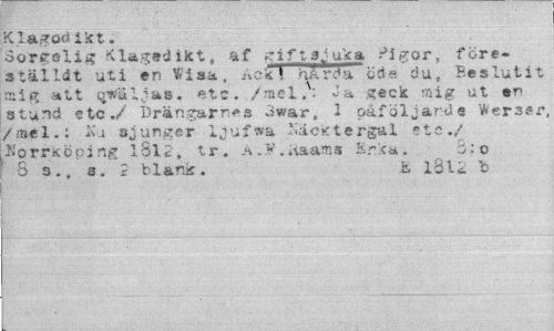//// Klagodikt. //// Sorgelig Klaged ikt, af gift aj uka ^igor, före» atäildt uti en Wisa, Ack! hårda ii de du, Beslutit Sig att qWa 1 ;as. etc. /mel v'a ireck mig ut en atu^d etc./ Drängarnes 3war, 1 påföljande Werser, /mel.: Ivj sjunger Ijufwa Näckterg&l st c./ Norrköping lSl«, tr. A.F.aaams lirka. i:o 8 a., s. 2 blank. fe 1812 b ////
