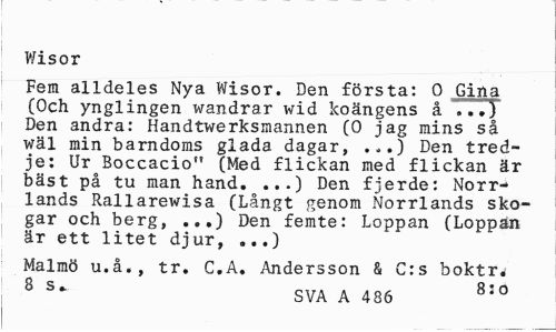 //// Wisor //// Fem alldeles Nya Wisor. Den första: O Gina (Och ynglingen wandrar wid koängens å ...) Den andra: Handtwerksmannen (0 jag mins så wäl min barndoms glada dagar, .„.) Den tredje: Ur Boccacio" (Med flickan med flickan är bäst på tu man hand, ...) Den fjerde: Norrlands Rallarewisa (Långt genom Norrlands skogar och berg, ...) Den femte: Loppan (Loppan är ett litet djur, ...) //// Malmö u.å., tr. C.A. Andersson & C:s boktr. 8 SVA A 486 8:0 ////
