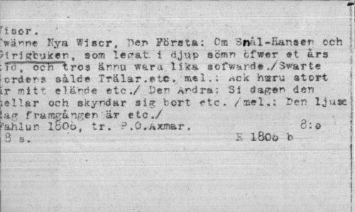 //// . j //// isor. //// 'wä^ne Nya Wiscr, Den Första; Cm Snål-Kanaen och , fIrjgfcukeri» som l e sr* t: i djup sömn tfwer et års io, och tros ännu wara lika sofward® ./Smarte ordens sålde Trälar.etc. mel.; ^ck hsrru stort .r mitt elände etc./ Den Andra; Si dagen den iellar och skyndar sig bort etc. /mel.; I^en ijuse .ag framgången "är etc./ : //// "ahlun I0O6, tr. ? .Ö.Äwnar. 8:0 //// 3 s. £• iSOo b //// - . - ¦. - - ¦ ¦ | //// I //// i ////