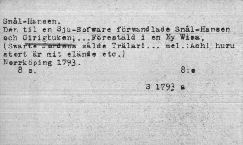 //// Snål-Hansen. //// Den til en Sju-Sofware fcrwandlade Snål-Hansen och Girigtukehi...Pörestäld i en.Ny Wi»a, ( Swaitt~Txt?69tn sålde TrälarJ ,.. fcel.:Achi huru stort är mit elände etc.) Norrköping 1793. //// 8 a. ' 8:e //// 3 1793 * ////