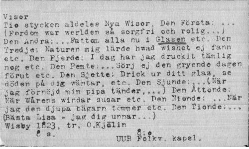 //// Visor //// Tio stycken alrieles Nya Wiaor, Den Första. ,.. (Fordom w&r vserlden så sorgfri och rolig, ) Den Andra; . . ,Fattas* alla nu i Glasen etc. Den Tredje; Naturen mig lärde hwad vishet ej fann etc. Den Fjärde; I dag har jag druckit tämlig nog etc. Den Femtec Sörj ej den gryende dagen "förut etc. Den Sjette; Drick ur ditt. glas, se döden på a ig vräntar, etc . Den SjundeNär jag förncjd min pipa tänder,.» 0) Den Åttonde När Warens windar 3usar etc i Den Nionde: ...När jag den djupa bägarn tcmmer etc» Den Tionde...? (Bästa Lisa - jag diar unnar . . ) Wistoy 1«23, tr. 0.Kjolin //// 8 s „ 8 ; e //// UtJB Folkv . kapsl. ////