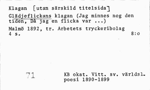 //// Klagan [utan särskild titelsida"] //// Glädjeflickans klagan (Jag minnes nog den tiden, Då jag en flicka var ...) //// Malmö 1892, tr. Arbetets tryckeribolag 4 s. 8:0 //// r»r KB okat. Vitt. sv. världsl. //// jJ poesi 1890-1899 ////