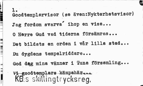 //// i * //// L 1« //// j Goodtemplarvisor (se även:Nykterhetsvisor) = Jag foräom svarva' ihop en visa... 0 Herre Gud vad tiderna försämras... //// | Det bildats en orden i vår lilla stad,.. //// i //// Du dygdens tempelriddare... - God dag mina vänner i xuna församling... g Vt-goodtemplars -kämpahär-*^. //// f KB:S skiUingtrycksreg, ////
