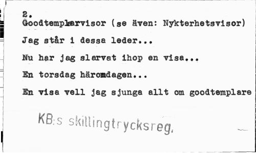 //// 2. //// | Groodtemplsarvigor (s© även: Nykterhetsvisor) Jag står i dessa leder».. Nu har jag siärrat ihop en visa... En torsdag häromdagen... //// En visa vell jag sjunga allt om goodtemplare //// KB.s skillingtrycksreg, ////