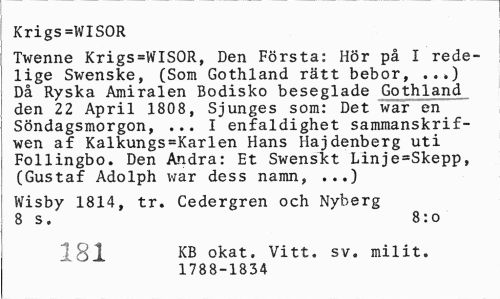 //// Krigs =WISOR //// Twenne Krigs=WISOR, Den Första: Hör på I rede-lige Swenske, (Som Gothland rätt bebor, ..») Då Ryska Amiralen Bodisko beseglade Gothland den 22 April 1808, Sjunges som: Det war en Söndagsmorgon, ... I enfaldighet sammanskrif-wen af Kalkungs=Karlen Hans Hajdenberg uti Follingbo. Den Andra: Et Swenskt Linje=Skepp, (Gustaf Adolph war dess namn, ...) //// Wisby 1814, tr. Cedergren och Nyberg 8 s. 8:o //// 181 KB okat. Vitt. sv. milit. //// 1788-1834 ////