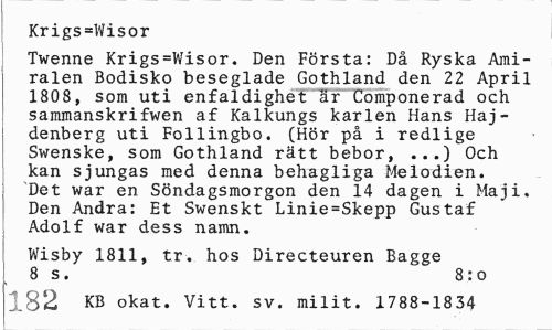 //// Krigs=Wisor //// Twenne Krigs=Wisor. Den Första: Då Ryska Amiralen Bodisko beseglade Gothland den 22 April 1808, som uti enfaldighet är Componerad och sammanskrifwen af Kalkungs karlen Hans Haj-denberg uti Follingbo. (Hör på i redlige Swenske, som Gothland rätt bebor, ...) Och kan sjungas med denna behagliga Melodien. Det war en Söndagsmorgon den 14 dagen i Maj i. Den Andra: Et Swenskt Linie=Skepp Gustaf Adolf war dess namn. //// Wisby 1811, tr. hos Directeuren Bagge 8 s. 8:o //// 182 KB okat. Vitt. sv. milit. 1788-1834 ////