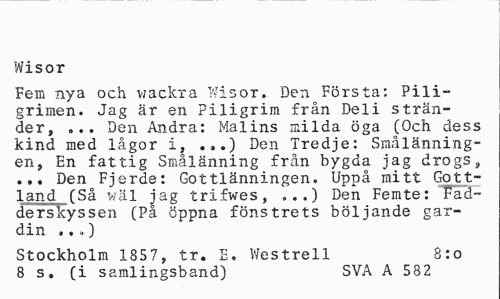 //// Wisor //// Fem nya och wackra Wisor. Den Första: Pili-grimen. Jag är en Piligrim från Deli stränder, ... Den Andra: Malins milda öga (Och dess kind med lågor i, .,.) Den Tredje: Smålänningen, En fattig Smålänning från bygda jag drogs, ... Den Fjerde: Gottlänningen. Uppå mitt Gott-land (Så wäl jag trifwes, ...) Den Femte: Fadderskyssen (På Öppna fönstrets böljande gardin ..») //// Stockholm 1857, tr. E. Westrell 8:0 //// 8 s. (i samlingsband) SVA A 582 ////