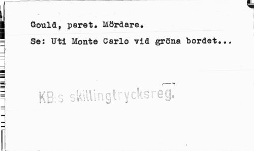 //// I //// 1 Gould, paret. Mördare. ! //// Se; Uti Monte Carlo vid gröna bordet... //// i //// 1 KB:s skiUingtrycksreg.' ////