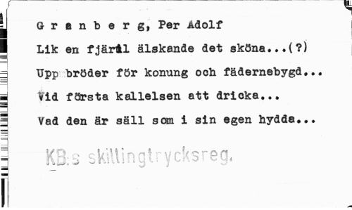 //// ^ Granberg, Per Adolf //// I Lik en fjäril älskande det sköna...(?) //// | Upp bröder för konung och fädernebygd... //// - Vid första kallelsen att dricka... //// | Vad den är säll som i sin egen hydda... //// t K8'S skillinqtrycksreq, ////