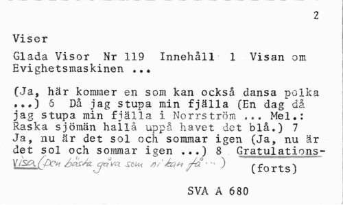 //// 2 //// Visor //// Glada Visor Nr 119 Innehåll 1 Visan om Evighetsmaskinen ... //// (Ja, här kommer en som kan också dansa poika ,..) 6 Då jag stupa min fjälla (En dag då jag stupa min fjälla i Norrström ... Mel.: Raska sjömän hailå uppå havet det blå.) 7 Ja, nu är det sol och sommar igen (Ja, nu är det sol och sommar igen ...) 8 Gratulations-V/JSgt (Pch ^»m S6U< /)/' få) (forts) //// SVA A 680 ////