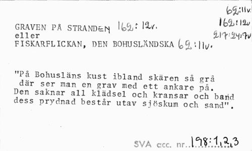 //// fefciMv //// i/a»i9/ lé&iia* //// GRAVEN PÄ STRANDtN _ . rt //// eller . JtlTiW //// FISKARFLICKAN, DEN BOHUSLÄNDSKA t>(l • 111/• //// "På Bohusläns kust ibland skären så grå där ser man en grav med ett ankare på. Den saknar all klädsel och kransar och band dess prydnad består utav siöskum och sand". //// SVA ccc. ////