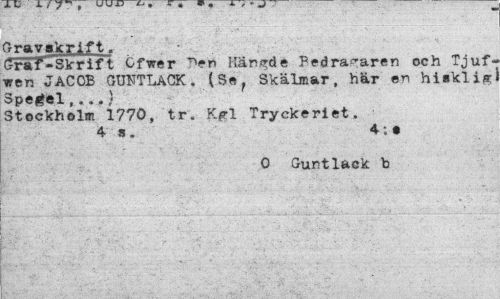 //// Gravskrift. //// SräT-Skrift Ofwer Kärade Pedra^aren och Tjuf< tren JACOB GUFTLACK. (Sef Skälmar, här en hiakli* Spegel,..,} //// Stockholm 1770, tr. Kgl Tryckeriet. //// 4 s. 4 ; o //// O Guntlack b ////