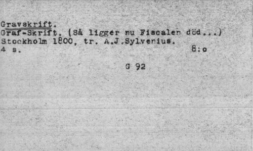 //// Iravekrift. //// sFaf^Skrif t. (Så ligger nu Fiacaler dcd...) Stockholm l800, tr. Å.J .Sylveriua. 4 s. 8;o //// G 92 ////