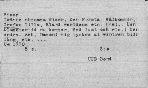 //// Vi ser //// Twänne nö.^sama W i ser. Den Farsta Walkomment 3refwe lilla. Bland werldens etc (mél,: Den Diameter tid nu kommer, Med lust och etc») Den Andra: Ach, Dam enl mis? tyckes a t wintren blir lång, etc ... U* 1770 //// 8 s» 8;o //// UUB Bond ////
