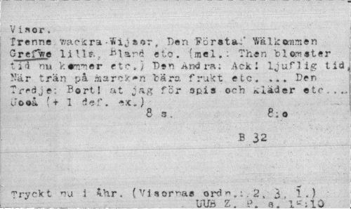 //// Visor, //// frenne Vackra - "ä i j »or t Den Första:' Fal kommen Grefwe lill*.. inarö et,o. (mel.. Then tiometer t i i nu kor.mer etc. i Den Andra; Ack ljuflig tid När trän på åarcsr^n bära frukt etc, ... Den Tredje: Bort! a t jag for apis och Kläder etc,.., uoaå ' + 1 -Jef. -:tj //// 8 3 8 ; o //// B 32 //// f ryck t nu i %Hr. (V i a orms ord « .:. . 2 . 3 1 .) //// Ulf» Z. P, «_ ////